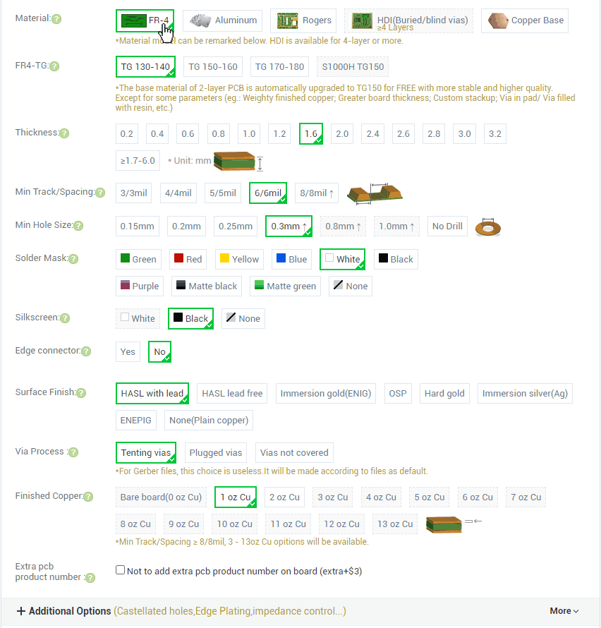 Of course, you can also change the default parameter values, such as the base material, surface finish, special processes, order notes